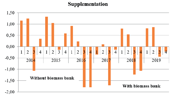 The previous showed that PC Supplementation is not related to the PC Production, and explains less the variability. In addition, it presented lower impact values during the years that the biomass bank was used. In practice, this indicates that before biomass bank, supplementation with preserved foods was insufficient to grow in the main productive indicators.