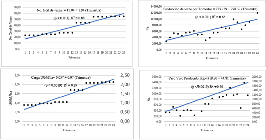 Linear regressions were estimated between total number of cows, milk production, produced live weight, stocking rate LAU/ha (Y) and trimester (X), with the application of REG procedure of SAS (2012).