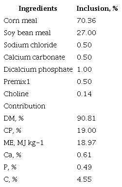 Feeding and management conditions. Table 1 shows the composition of the provided diet. Food was provided in the form of corn-soy-based meal, according to NRC (2012).