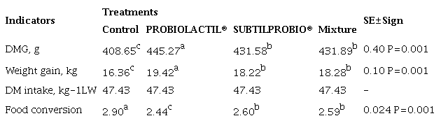 Table 2 shows the performance of productive indicators in pigs that consumed the different biopreparations.