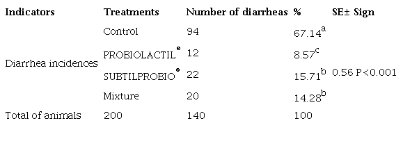 The University of Matanzas and the Institute of Animal Science (ICA, initials in Spanish) carried out different research projects for the development of economically viable products that would improve productive yield and animal health (Pérez 2000, Milián 2009 and Rondón 2009). Among the obtained probiotics were SUBTILPROBIO® (culture of Bacillus subtilis C-31) and PROBIOLACTIL® (culture of Lactobacillus salivarius C-65), evaluated in broilers, layers (Rondón et al. 2018 and Milián et al. 2019), calves (del Valle 2017 and González 2019) and pigs (Ayala et al. 2014) with excellent results in weight gain, improvements in food conversion and decrease of diseases. However, the effect of these additives has not been evaluated yet, when they are applied mixed in the animal diet.