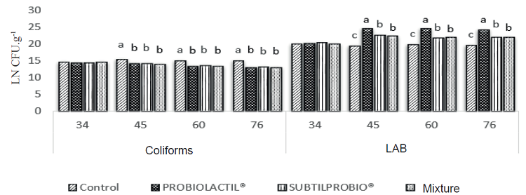 Doses of additives was adjusted to 109 CFU.mL-1, which were mixed with water for homogenization. Samplings were carried out at 34, 45, 60 and 76 d.