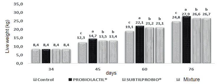 Figure 2 shows the performance of live weight in the evaluated animals, with the use of PROBIOLACTIL®, SUBTILPROBIO® and its mixture during pre-fattening. An increase of live weight (P <0.05) was observed in pigs treated with the biopreparations with respect to control group. This increase was observed after 11 d of application, which corresponds to 45 d of birth. Regarding control, it was found that from that age, up to 76 d, weight gain occurred in all the treatments in which biopreparations were applied. However, the best results were achieved with the administration of PROBIOLACTIL®, followed by SUBTILPROBIO® and their mixture.