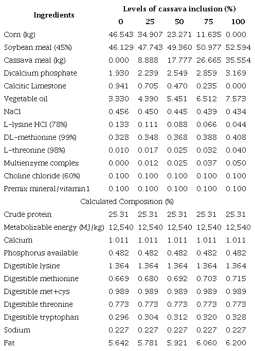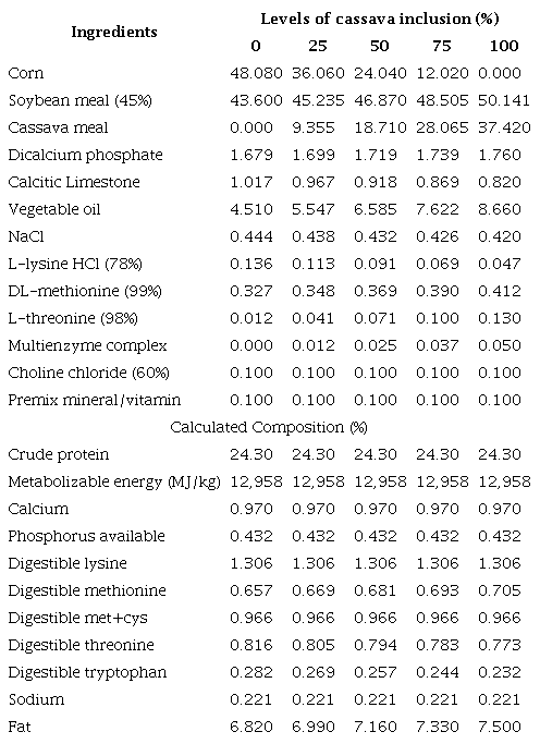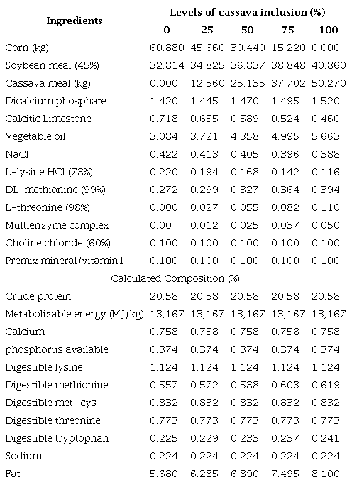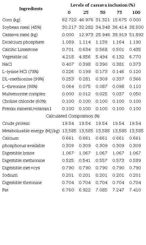 The result of the chemical composition was used to formulate the experimental diets together with the metabolizable energy of 12,502 MJ/kg (determined in a metabolism experiment carried out previously with chicks, this experiment was carried out before formulating the diets).The multi-enzyme complex was composed of galactosidase 35 U/g, galactomannanase 110 U/g, xylanase 1,500 U/g, β-glucanase 1,100 U/g, and was mixed to the premix in a Y-type mixer for mixing low level ingredients in the diets and used in the proportion of 500 grams per ton of feed for the test diets, for greater availability of nutrients contained in whole cassava meal.