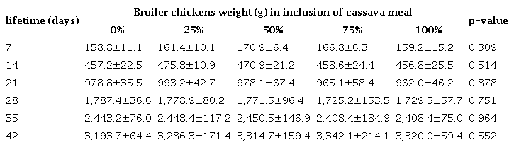 Mean weight of the birds in relation to the lifetime and the different diets with cassava meal are shown in table 6. For all evaluation periods, verified that there was not difference (p-value> 0.05) in the broiler chickens weight in relation to the different levels of cassava meal in diet (table 6).