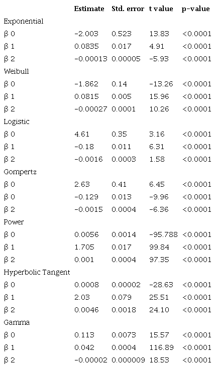 Table 8 shows the estimates of the parameters of the models with their respective standard errors, test statistics and p-value, showing the significance of each parameter.