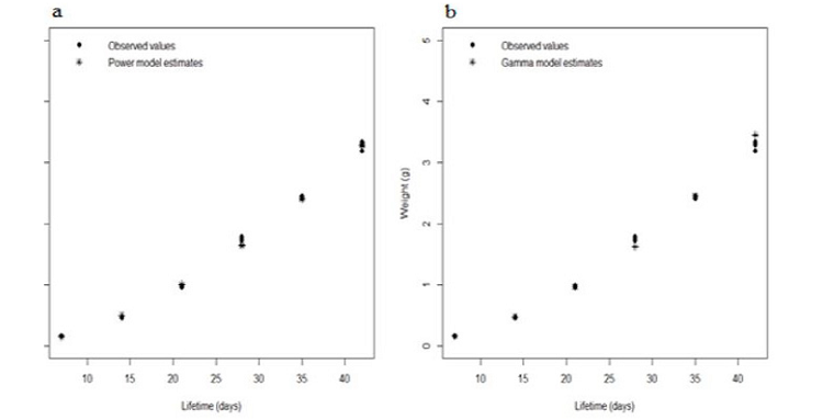 Figure 1 shows that the power model presented better estimates of broiler chickens weights than the Gamma model, because the power model showed only a discrepant value from the observed weight of the chickens that occurred on the 28th day, while the Gamma model presented two weight discrepant occurrences (28th and 42nd day).