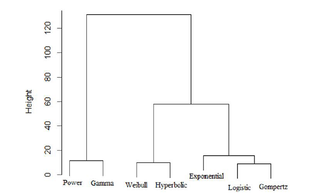 Through Ward cluster method using the metrics of model adequacy criteria, verified the formation of two groups of modelswhen using a cutting height greater 60, a group formed by the power and gamma models (models that presented higher R² and lower SSR and AIC), and the second formed by the others models (models that did not present criteria similar to the gamma and power models) (figure 2).
