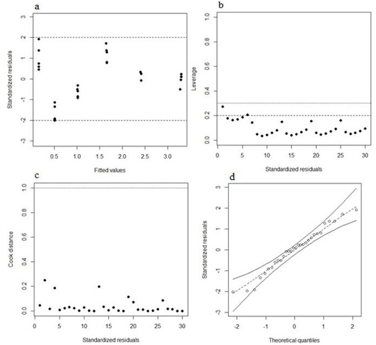 After defining the power model with most appropriate, the analysis of the residues was performed (figure 3).No discrepant residues were diagnosed (figure 3a),because none is outside the limits of [-2; 2],also no residual leverage or influence was detected (figure 3b and 3c) because no point exceeded the criteria defined by the dotted lines, the assumption of normality of the residues was diagnosed in the quantile-quantile graph of the normal distribution, where the residues are within the confidence bands (figure 3d).