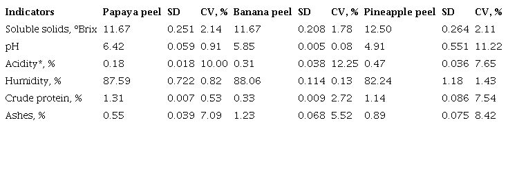 Table 1 shows the results of chemical composition of papaya, banana and pineapple peels. These values are similar to those reported in the literature. FAO (2007) stated that papaya has approximately 13% sugars, 85% humidity and 0.6% protein. They pointed out that pineapple contains from 12 to 15% sugars, 80 to 85% water and 0.58% protein, and banana has 79.2% humidity, 0.83% protein and 12% sugars.