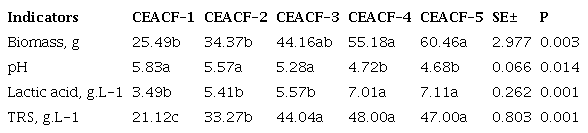 Table 2 shows the results of Lactobacillus plantarum CAM-6 growth in each of the evaluated treatments to obtain the CEACF culture medium. It was verified that the highest (P <0.05) biomass, lactic acid and TRS production was presented in CEACF-4 and CEACF-5 media. It was also demonstrated that the lowest pH values were found in the last two variants. These results demonstrate that Lactobacillus plantarum CAM-6 is capable of producing acids that lower pH in these media. Probiotic bacteria, especially lactobacilli, transform carbon sources into organic acids that intervene in the inhibition of pathogenic microorganisms and in mineral solubilization, in addition to contribute to the maintenance of the intestinal mucosa integrity (Vera et al. 2018).