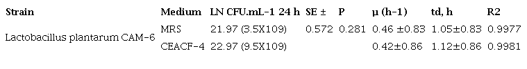 CEACF-4 medium was suitable for the growth of Lactobacillus plantarum CAM-6 (table 3). Comparing growth of the strain in this medium with respect to MRS, no differences were observed.