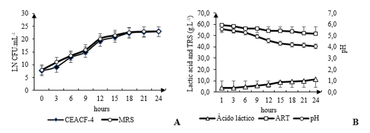 Figure 1A shows the results of growth kinetics of Lactobacillus plantarum CAM-6 in CEACF-4 and MRS media for 24 h. It is demonstrated that there are no differences in the count of CFUs during the sampling hours, when both substrates are used (P ˃ 0.05). In each case, the initial population began its growth from the first hours, and once in the exponential phase, cells reproduce at maximum speed without limitation of nutritional substances. Figure 1B shows that the higher the lactic acid production, the lower the TRS concentration and pH in CEACF-4 medium. LABs are known to use fermentable carbohydrates as an energy source mainly to form lactic acid (Zamudio and Zavaleta 2003).