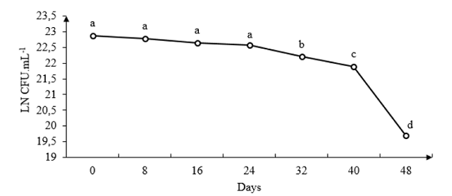 Figure 2 represents performance dynamics of Lactobacillus plantarum CAM-6 viability, grown in CEACF-4, from the first day to 48 d of sampling. Until 24 d, the biopreparation showed count stability under refrigeration conditions (>21 LN CFU.mL-1). It is precisely after that time that the decrease in viable cells in the biopreparation is evident, although cell population that contains at 48 d (19 LN CFU.mL-1) is sufficient to develop probiotic activity (>108 CFU.mL-1). Jin et al. (1998) defined that probiotic biopreparations should contain 109 CFU.mL-1 to exert their effect.