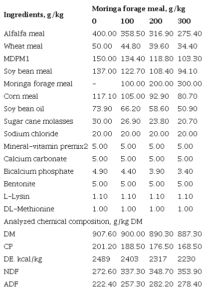Preparation of forage meal. The tree species Moringa oleifera cv. Brazilian, established at the Estación Experimental de Pequeños Animales de Carpina, from the Universidad Federal Rural de Pernambuco. Moringa forage meal was made from leaves, petioles and fine stems, collected at 60 d of age. The cut was manually performed, at a height of 50 cm. Drying of plant material was carried out for five days in a warehouse, protected from sun and rain. To ensure it dries evenly, and to avoid the development of fermentation processes, it was turned over three times a day. Finally, the plant material was reduced to a particle size of 3 mm in a hammer mill. Moringa forage meal was packed in 50 kg jute bags. It was kept indoors and aerated until its use. Six representative samples, 500 g each, were taken from a single batch of forage meal. Samples corresponded to five areas of the bags (upper and lower corners and center). They were stored in glass jars and stored at room temperature for 10 d. Analyzes were carried out by triplicate. Table 1 shows the chemical and energy composition of moringa forage meal.