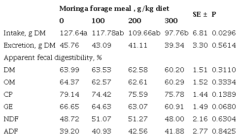 Table 3 describes the apparent fecal digestibility of nutrients in rabbits fed diets containing increasing levels of moringa forage meal.