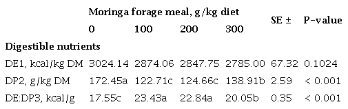 Digestible energy content in rabbits did not differ among treatments (table 4). In contrast, digestible protein decreased (P<0.001) in the animals that consumed the diets with moringa forage flour. The group that ingested the diet with 300 g/kg of moringa forage meal increased the DP contribution by 16.2 and 14.25 g/kg DM with respect to the treatments with 100 and 200 g/kg of moringa forage meal in the diet. This effect was determined by the reduction of crude protein content in diets with moringa forage meal (100 and 200 g/kg, respectively). Villamide et al. (2010) stated that the nutritional value of a protein is determined not only by its amino acid composition, but also by its digestibility or proportion of ingested protein that is digested in the intestine. However, values obtained are higher than DP requirements proposed by Xiccato and Trocino (2010) for this animal category (105-110 g/kg DM).