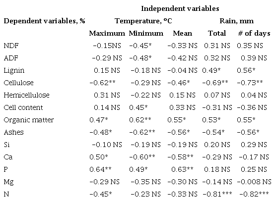 The correlation between climate factors and chemical composition was variable (table 1). The highest coefficients (r) were obtained for P, with the maximum temperature (0.64) and mean temperature (0.63), OM and ash with the minimum temperature (0.62 and -0.62, respectively), cellulose with the maximum temperature, total rainfall and number of days with rains (-0.62, -0.69 and -0.73, in the same order) and nitrogen (N) with rains and their distribution (-0.81 and -0.82, respectively). For the rest of the chemical composition indicators, correlations were low or not significant.