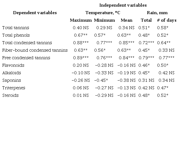 The highest correlations (table 2) were found: between total phenols, total condensed tannins, fiber-bound condensed tannins and free condensed tannins with maximum temperature (between 0.67 and 0.89) and mean temperature (between 0.63 and 0.85); for total condensed tannins and free condensed tannins with the minimum temperature (0.77 and 0.76, respectively) and these same compounds with total rain (0.72 and 0.79, respectively) and with number of days with rain (0.64 and 0.77, respectively). For the rest of the secondary metabolites, correlations were low or not significant.
