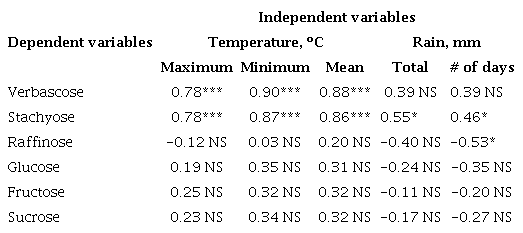 The highest coefficients between verbascose and stachyose (0.78-0.90) were obtained with temperatures (maximum, minimum and mean). For the rest of sugars, no relationship was found with temperatures, while relationships were low or not significant with rains and their distribution (table 3).