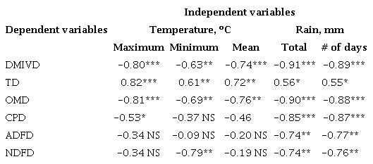In the references consulted, no article similar to the present study was found and it was interesting to find the negative and significant influence between maximum, minimum and mean temperatures (correlation coefficient between -0.63 and -0.81) and the DMIVD and OMD, but rains and their distribution also showed negative and highly significant correlation coefficients (between -0.88 and -0.91). Nevertheless, for CPD, NDFD and ADFD, the highest negative and significant correlations were obtained with rainfall and its distribution. These elements could serve as an alert to carry out the efficient management of this species during rainy period, characterized by high temperatures and precipitations.