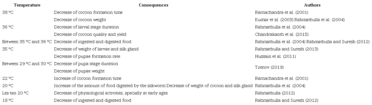 Among the environmental factors that must be considered during larval rearing, temperature is probably the most important, as it is a poikilothermic animal, unable to regulate body temperature through internal mechanisms (Reddy 2001). Generally, early ages are more resistant to high temperatures, which increases survival and improves quality of produced cocoons. As temperatures rise, organic functions increase and, conversely, at low temperatures they decrease. The optimum temperature range for rearing larvae with high productivity levels varies between 23ºC and 28ºC (Parrey 2018 and Rahmathulla 2012). Table 1 shows the effects of some temperature values, other than the optimum, in B. mori breeding.