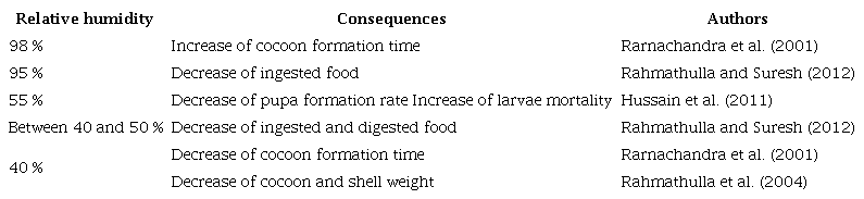 Temperature and humidity act synergistically on larval growth and development and on cocoon quality (Reddy et al. 2002). At early ages, larvae endure higher relative humidity values than adult worms, and vigorously grow under these conditions. Table 2 shows the effects of some humidity values on B. mori breeding, regardless of temperature.