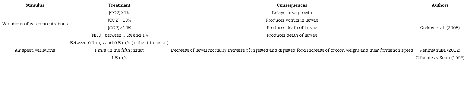 Larvae have high oxygen requirements, especially when they are in their fourth and fifth age. Gases are produced during rearing, which modify air composition in the facilities. CO, NH3 and SO2 are some of the released gases in the facilities during rearing, due to the fermentation of animal and vegetable wastes, as well as the activity of humans (Rahmathulla 2012). Concentrations of 1% of CO2, 0.02% of SO2 and 0.1% of NH3 in the air are adequate limits for B. mori rearing (Singh et al. 2009). Young larvae are more susceptible to toxic gases, so artificial air circulation is sometimes useful (Grekov et al. 2005). Table 4 presents the effects of ventilation on B. mori rearing.