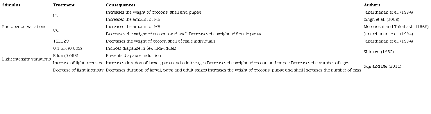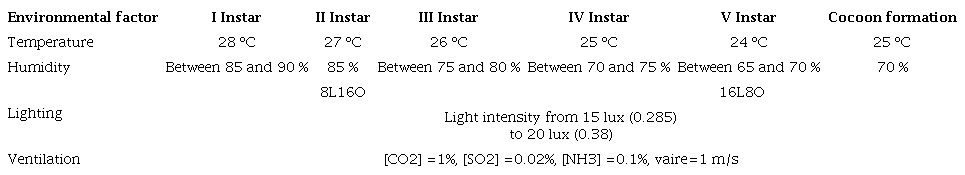 Larvae optimally develop at light intensities between 15 lux to 20 lux. Young worms, subjected to periods of 16 hours of darkness and eight hours of light, have better survival. The same occurs for adult worms, subjected to periods of 16 hours of light and eight hours of darkness (Rahmathulla 2012). Table 4 shows the effects of lighting on B. mori rearing. The optimal environmental conditions for silkworm rearing are presented in table 5.