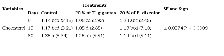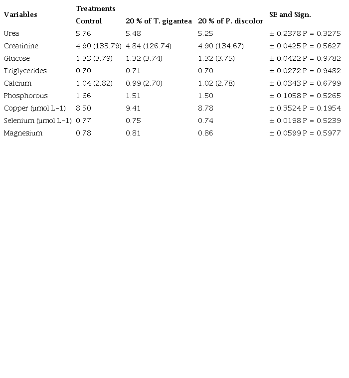 The analysis of blood metabolites showed interaction (P = 0.0009) among treatments and sampling days (table 3). In the case of cholesterol, values were within the normal range for this species (2.07 to 3.11 mmol L-1) (Kaneko et al. 2008). Results indicated that, at 30 d of supplementation, values of control and 20% of T. gigantea treatments increased by 1.23 and 1.20 times, respectively, when taking the begining as a reference. Meanwhile, the treatment with 20% of P. discolor did not differ between periods. This treatment decreased its concentration by 19.01% with respect to control, at 30 d of supplementation.