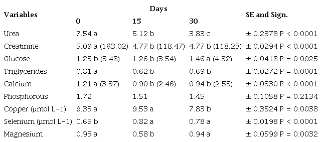When analyzing the sampling periods (0, 15 and 30 d), differences were registered in the concentration of metabolites urea, creatinine, glucose, triglycerides, calcium, copper, selenium and magnesium (table 5).