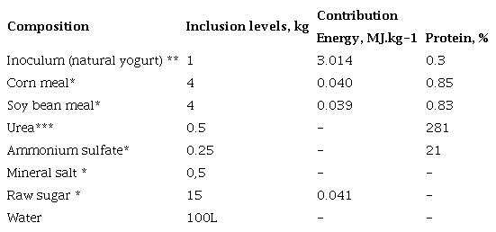 To obtain the microbial preparation, the methodology proposed by Elías and Herrera (2008), modified by Beruvides et al. (2018), was used as a guideline. For this research, five batches were elaborated, prepared in 20 L plastic tanks at the same time, in which all the components were weighed and mixed with the substitution of the final molasses, as carbon source, for raw sugar plus the addition of inoculum (natural yogurt). The biopreparation was kept in fermentation for 96 h, at room temperature (24 oC), and was activated every 12 h by shaking with a wooden paddle. Its formulation is presented in table 1, as well as the energy and protein contributions of the used raw materials.