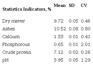 Statistical analysis. Dispersion statistics (mean, standard deviation and coefficient of variation) were used for the chemical and microbiological characterization of VITAFERT. The pH values, concentrations of LAB and yeasts were processed by means of a one-way analysis of variance and Duncan (1955) test for P<0.05. Data was processed in INFOSTAT statistical package, version 2012 (Di Rienzo et al. 2012).