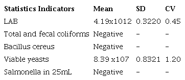 The microbiological analysis did not show contaminating microorganisms in VITAFERT samples (table 4). These results may be caused by the presence of high concentrations of organic acids (mainly lactic and acetic) or bacteriocins provided by LAB (superior to 109 CFU.mL-1), which allow the product to be kept free of contaminants, which makes it viable for the use in animals.