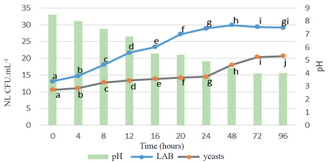 Figure 1 shows the results of LAB and yeast count over time. It was found that during fermentation process, LABs grow to values of 29 natural logarithm (NL) UFC.mL-1 and yeasts, in the order of 20 NL UFC.mL-1.