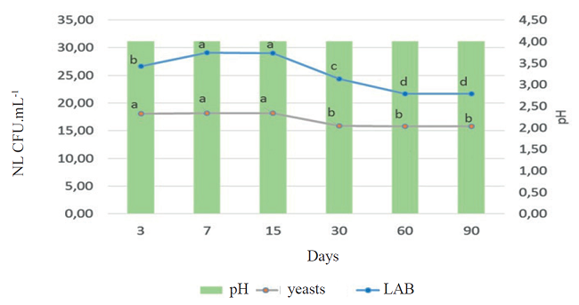 As demonstrated in figure 2, yeasts from three to 15 d maintained values of 107 CFU.mL-1. Subsequently, there was a decrease of viable cells (106 CFU.mL-1) from 30 d, remaining in this order until the end of the study. LABs gradually increased during the first 15 d to 1012 CFU.mL-1. Then, there was a decrease to 109 CFU.mL-1 at 90 d. The pH showed a value of 4.0 after 72 h, and maintained its stability until 90 d. This result could be associated with the production of organic acids (lactic, acetic, propionic and butyric) by LABs (Vázquez et al. 2009).