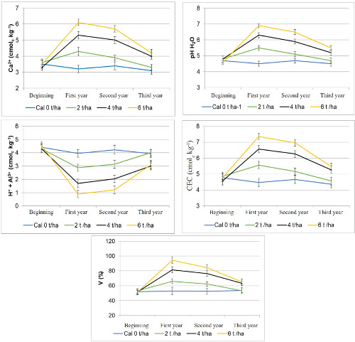 Regarding the permanence of liming effect on the reduction of soil acidity, Da Costa et al. (2016) and Abdi et al. (2017) observed that it lasted up to 48 and 60 months, respectively, a time longer than that observed in this research. However, it has been shown that lime residuality depends on the nature of the liming material, doses and forms of application, as well as the properties of soil and crop (Li et al. 2018).