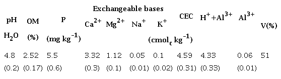 The influence of liming on acidity reduction can be attributed to the displacement of exchangeable H and Al by Ca, provided by the liming material and, consequently, to the increase of the concentration of OH ions in the soil solution as a result of these reactions, which agrees with reports of Opala et al. (2018) and Dereje et al. (2019).