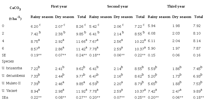 There was no interaction among lime doses and pasture species for dry mass yield. However, the levels of both factors showed significant differences between them (table 2). The highest yields, in rainy and dry season, were reached with the doses of 4 and 6 t ha-1 of lime during the first two years of its application. In the third, the liming effect disappeared, coinciding with the decrease in the influence of the amendment of exchangeable Ca content and the reduction of soil acidity. Among pasture species, the highest dry mass yields were reached by Yacaré.