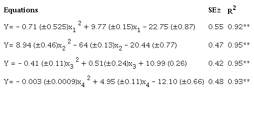 By relating annual yields of pastures with the performance of the variables that characterize acidity, according to the results of soil analyzes carried out each year, quadratic trend regression equations were found with high fit levels (values of R2 higher than 0.90), as shown in table 3. That is, the increase of yields was associated with pH increments, exchangeable Ca content and base saturation percentage, as well as a decrease of soil exchangeable acidity.