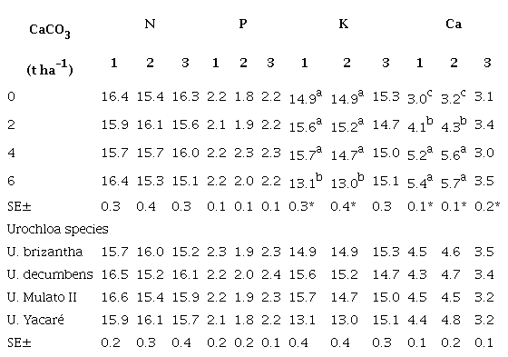 Liming and pasture species had no effect on N and P concentrations in the biomass. However, Ca concentrations increased significantly with lime additions, reaching the highest values with doses of 4 and 6 t ha-1 (table 4).