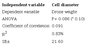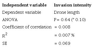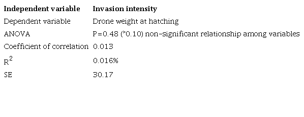 By taking invasion intensity as an independent variable and the morphometric parameters of drones at hatching (body length and weight) as dependent variables, a weak or non-significant relationship was determined (tables 10 and 11).