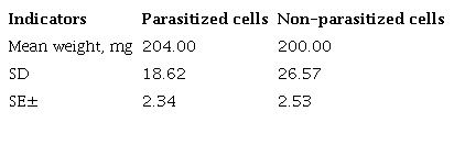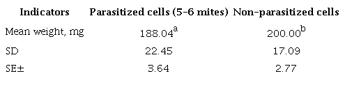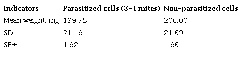 The result was different when comparing the weights of hatched individuals from cells with 5-6 mites, but not with 3-4 mites and those not parasitized (tables 13 and 14).