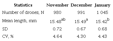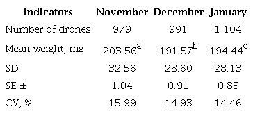 There does not seem to be a clear explanation for the differences in mean weight of drones between November and December-January (table 7).