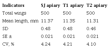 Table 4 shows the mean length of the right forewing between 11.31 ± 0.46 mm and 11.37 ± 0.48 mm, without a significant superiority, in the SJ apiary.