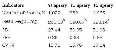 The mean weight of drones at birth (table 5) is between 190.67 mg and 200.13 mg, with the lowest values in the T1 apiary and the tendency to supremacy in SJ.