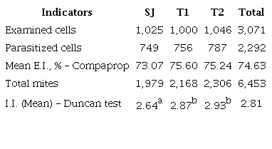 The extent of invasion in this brood was high, to the extent that its mean values exceeded 70%, in SJ as in the hives of T1 and T2 (table 8). These values are at the level of those determined in 1996-1997 by Demedio (2001) at the beginning of the epizooty of varroosis, in San José de las Lajas municipality. They are also consistent with reports by Sanabria (2007) and Sanabria et al. (2015), also in the same area. Apparently, the situation is unusual because then, the first contact of the local bee with the parasite occurred. Meanwhile, by 2016, there was a history of coexistence. According to some criteria (Pérez-Morfi and Pérez-Piñeiro 2018), the current bees are descendants of those that survived the initial impact of the mite, a result of natural selection, and the subsequent work of the selection and improvement program that continues today. Apparently, it is not appropriate to talk about natural selection in intensive beekeeping.