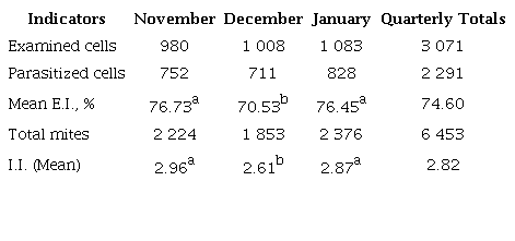 When comparing the results in the three months of study, differences were appreciated between December and January. However, both months did not differ from November (table 3), which is attributed to the age of the combs.