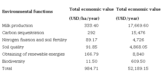 This integrative analysis of the dairy farm allows managing the livestock activity from a multidimensional point of view. An ecosystem cannot be efficiently managed, if all the generated environmental functions are not taken into account. This way, it is possible to appreciate the different economic benefits that can be obtained from the environmental goods and services offered by these ecosystems, and, thereby, encourage farmers to promote their generation.