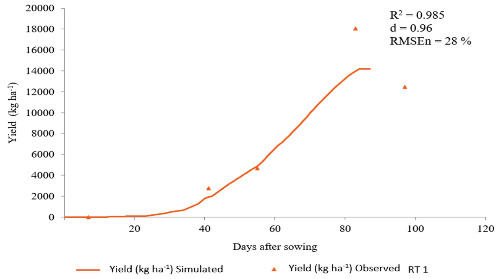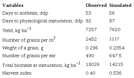 Table 7 shows the comparison of the observed and simulated values, in terms of days to anthesis, days to maturation and yield. The simulated yields were related to those observed, showing a d = 0.96. The RMSEn behaved with an acceptable value of 28% and R2 of 0.985. This shows the good fit of the crop simulation model (figure 1) (Tovihoudji et al. 2019 and Tofa et al. 2020).